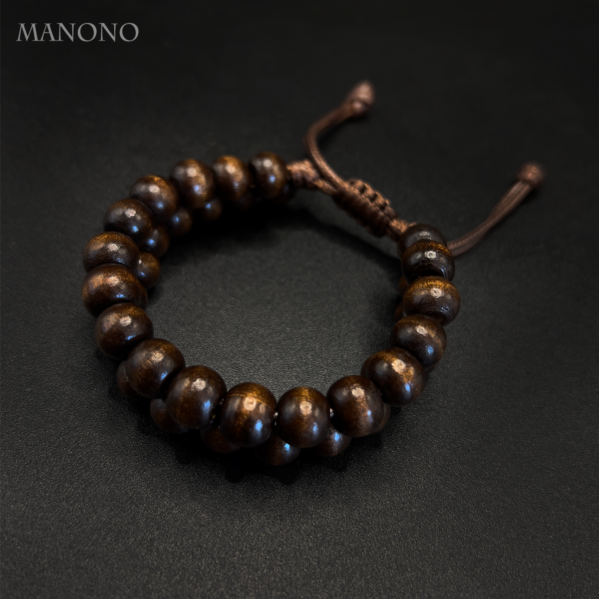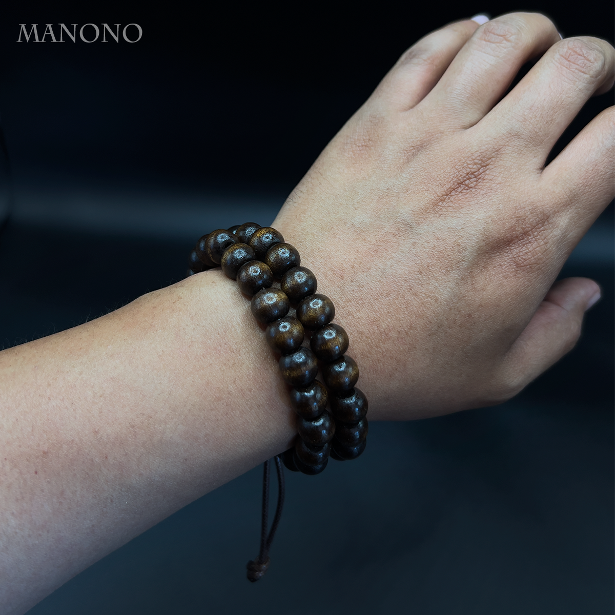 Pulsera ajustable con doble linea, elaborada en cuentas de madera de 10mm coloca café. *Incluye sobre de regalo.