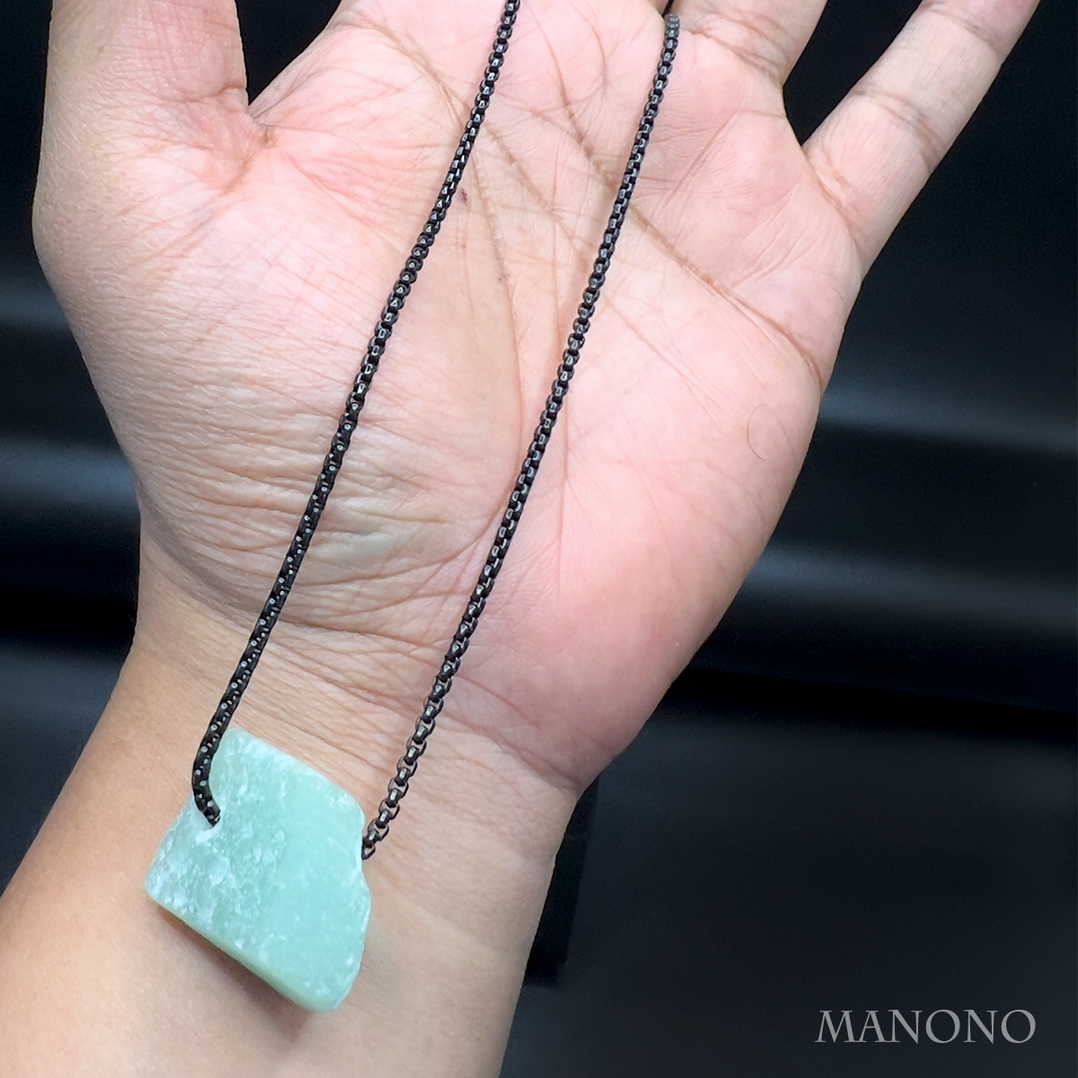 Collar de acero inoxidable negro con dije Cuarzo Verde Rústico.