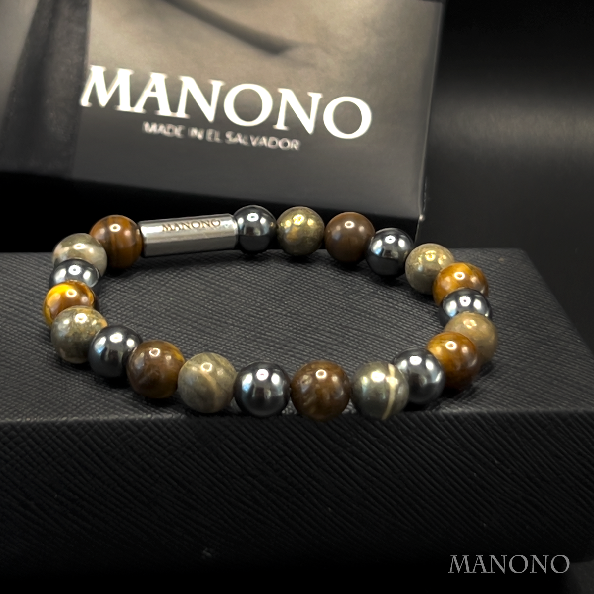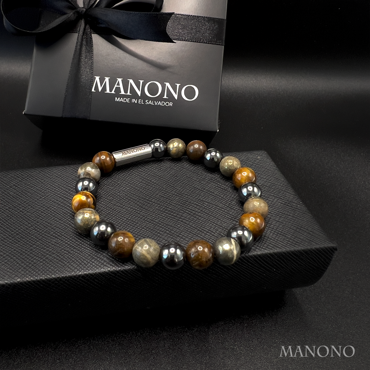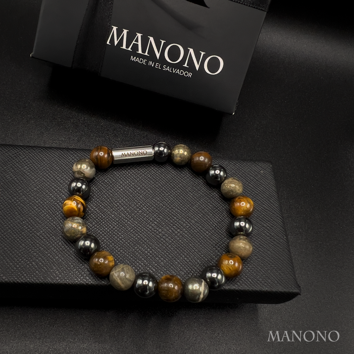 Una pieza premium diseñada para expresar fuerza silenciosa. La combinación de hematite, pirita y ojo de tigre de 8 mm crea una presencia sólida y elegante, acompañada de un separador de acero con el sello de la marca. Se adapta por talla, porque el verdadero poder también se ajusta a quien eres.