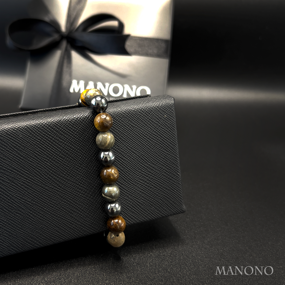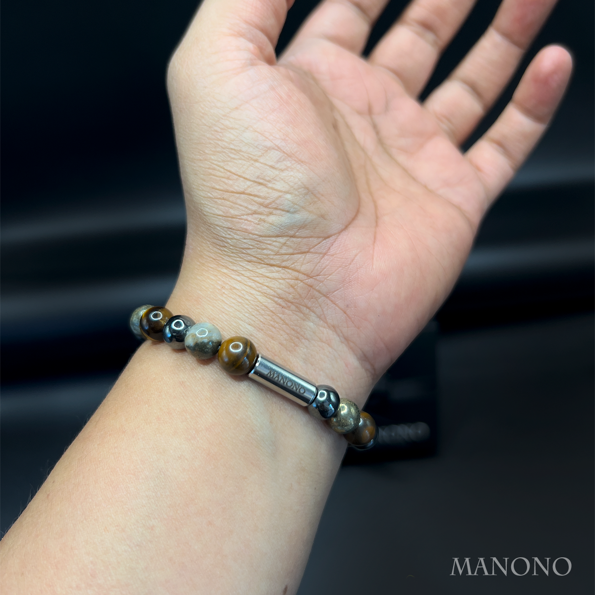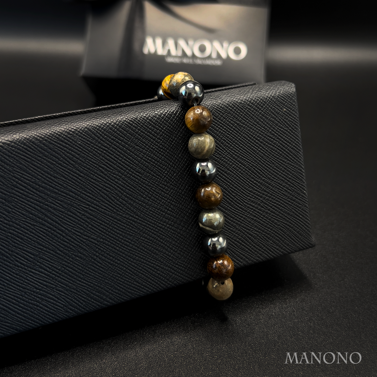 Una pieza premium diseñada para expresar fuerza silenciosa. La combinación de hematite, pirita y ojo de tigre de 8 mm crea una presencia sólida y elegante, acompañada de un separador de acero con el sello de la marca. Se adapta por talla, porque el verdadero poder también se ajusta a quien eres.