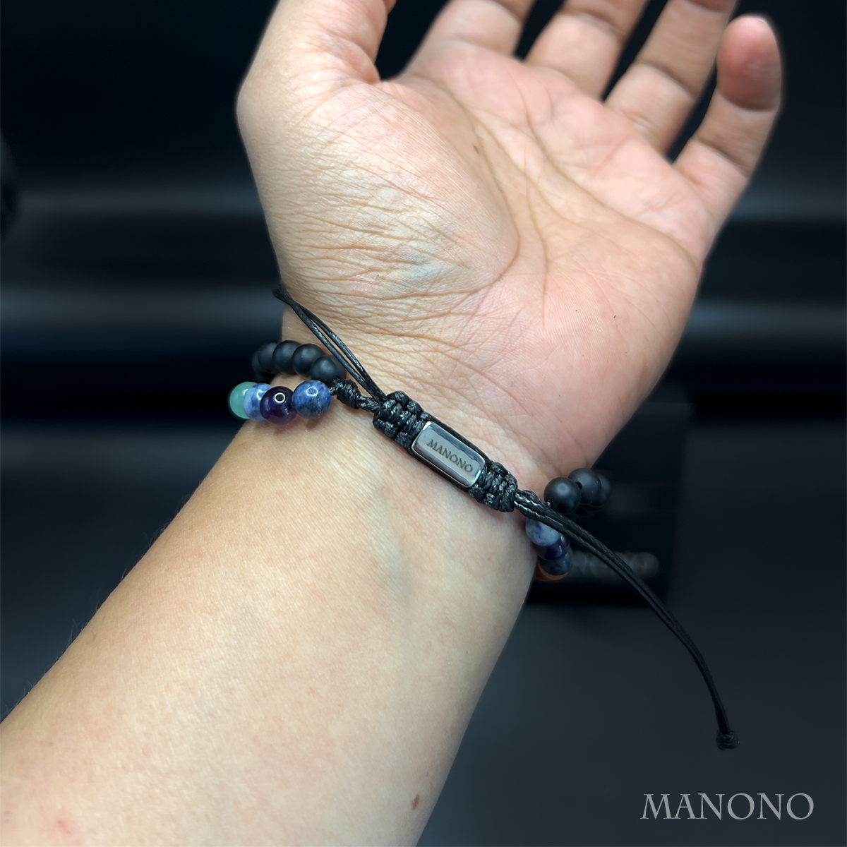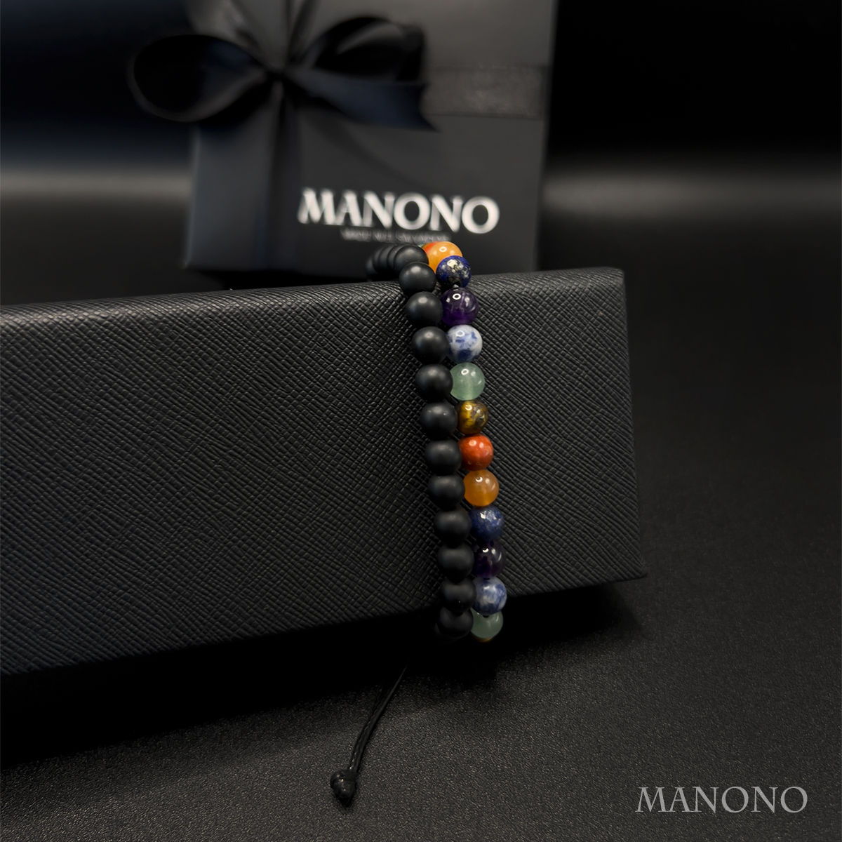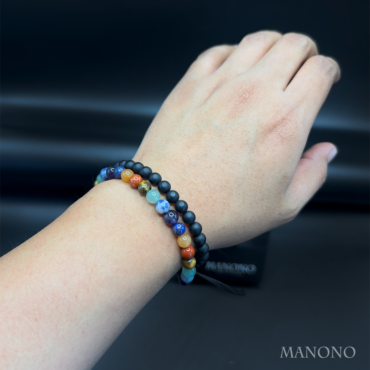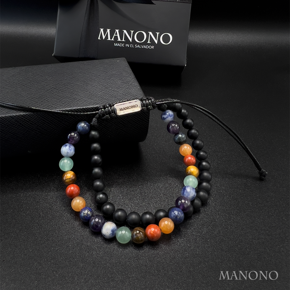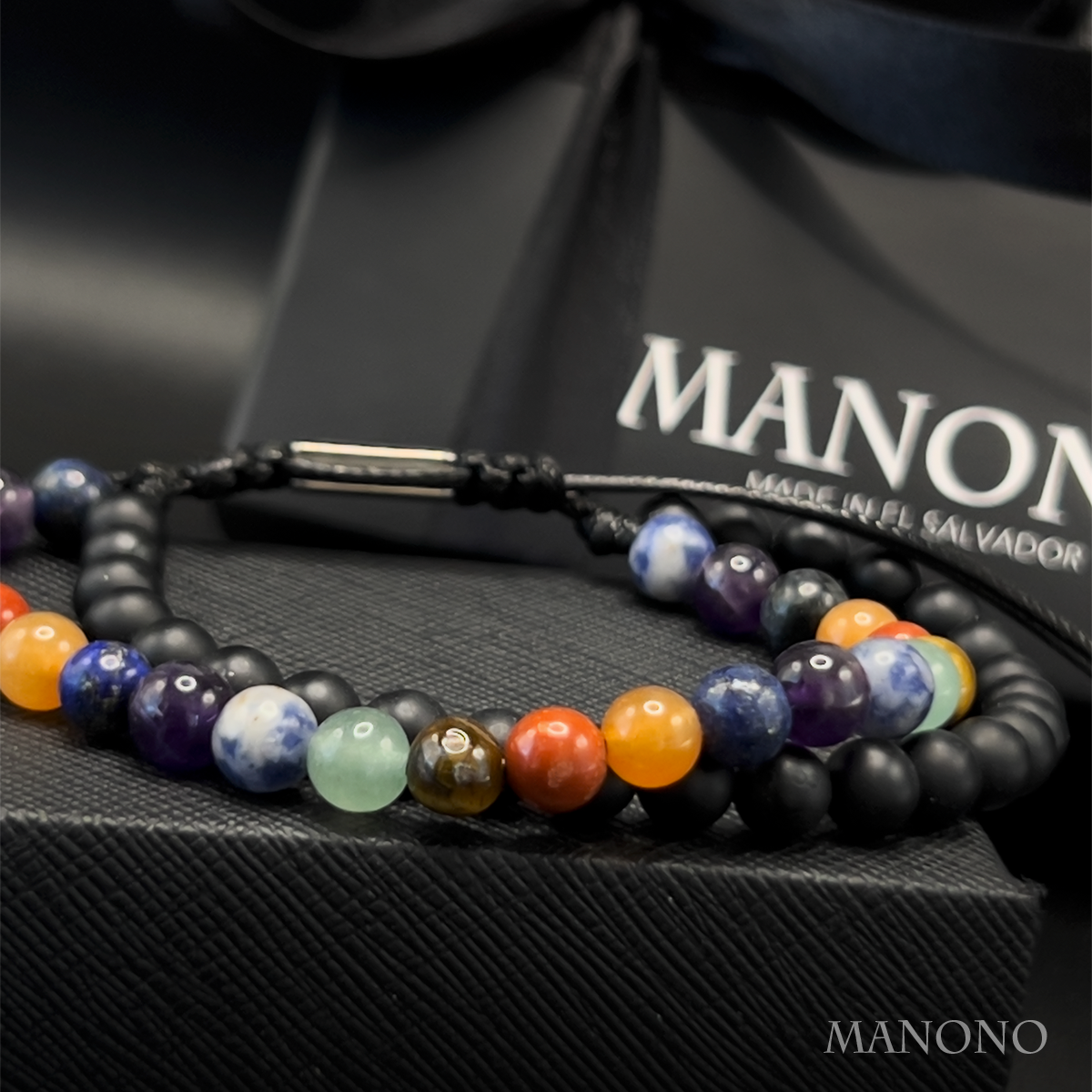 La misma dualidad del equilibrio interior, ahora con una presencia más firme. El ónix negro mate se une a piedras naturales de colores en 6 mm para expresar que la armonía no es debilidad, sino decisión consciente de aceptarte completo.